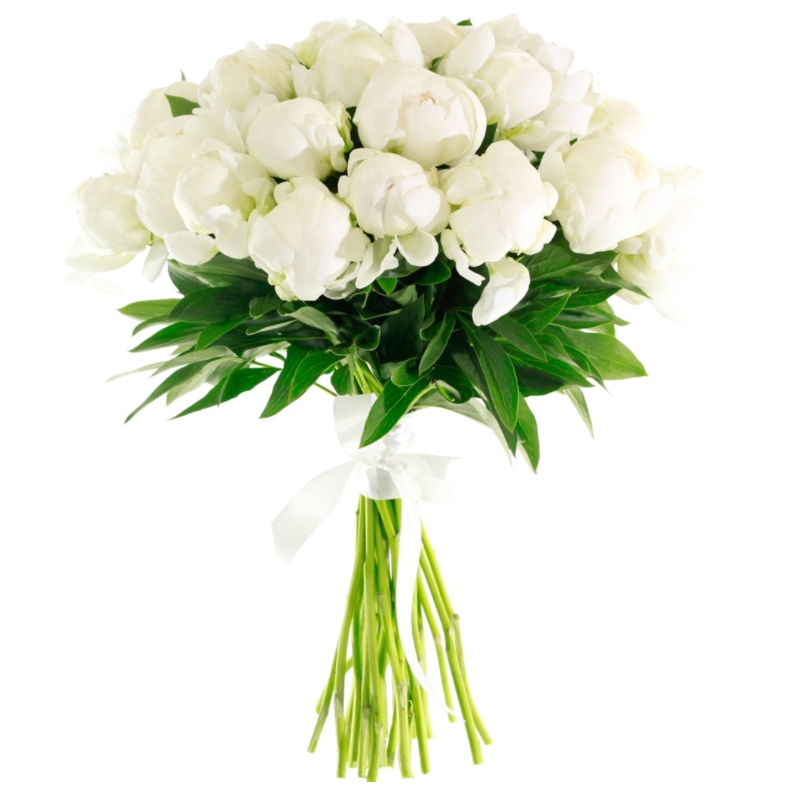Букет состоит из 25 белых пионов, прозрачная упаковка, атласная лента.