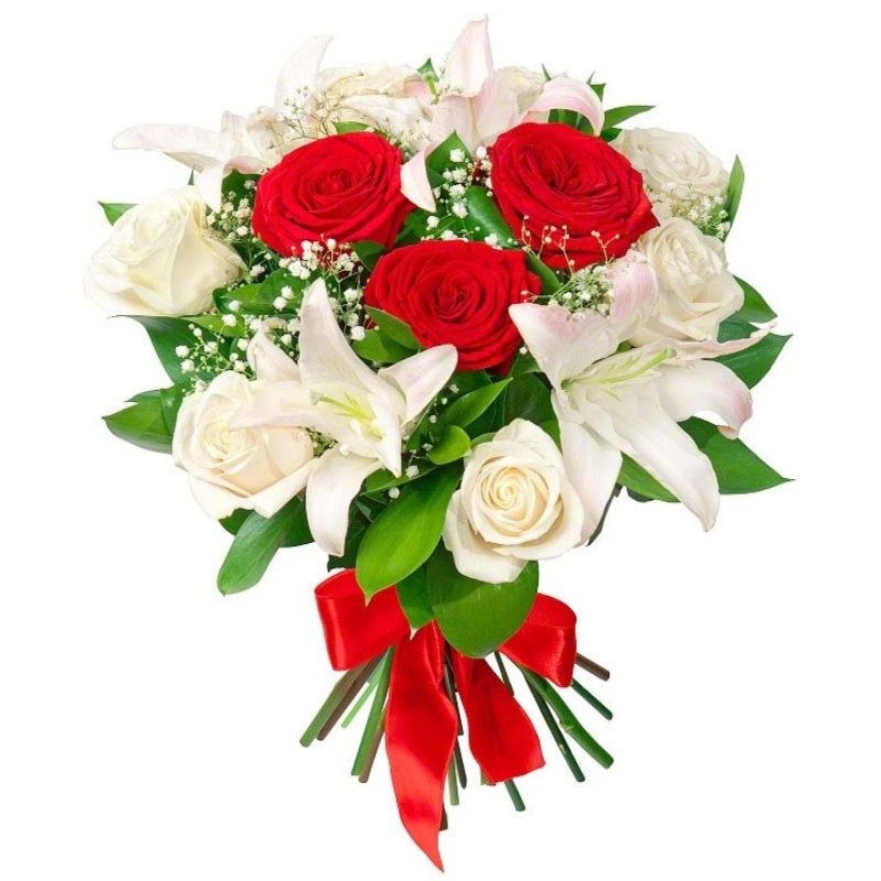 Букет состоит из 7 белых роз, 3 красные розы, 3 гипсофила, зелень, прозрачная упаковка, атласная лента.
