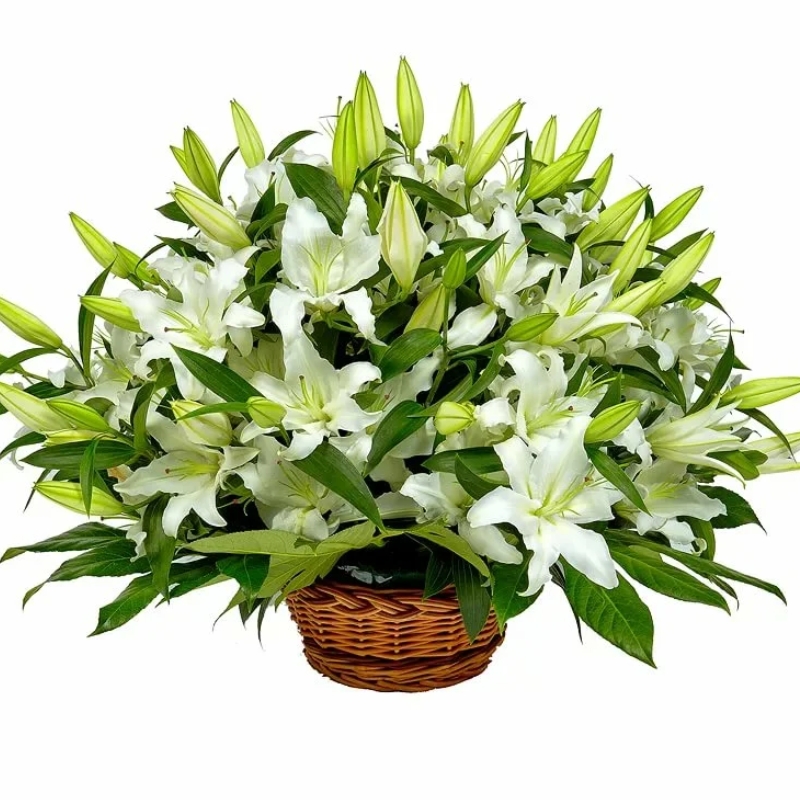 25 веток белых лилий, корзина, оазис.