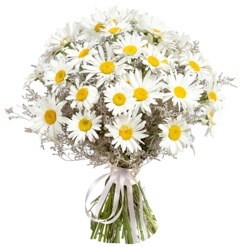 Букет состоит из 35 ромашек, 9 лимониум, прозрачная упаковка, атласная лента.
