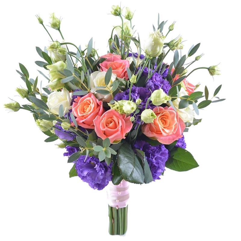 Букет состоит из 15 коралловых и белых роз, 6 веток эустомы, эвкалипт, прозрачная упаковка, атласная лента.